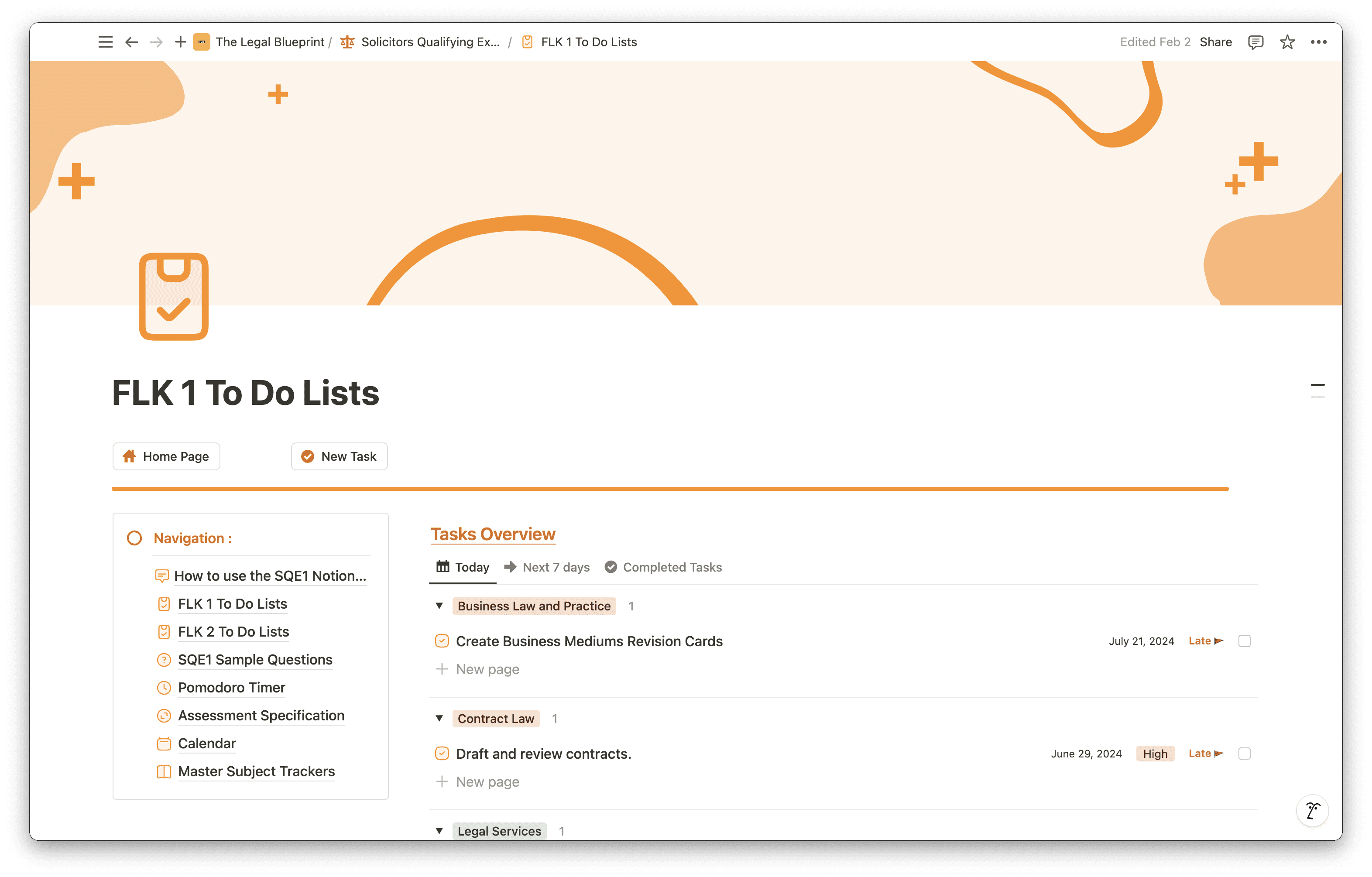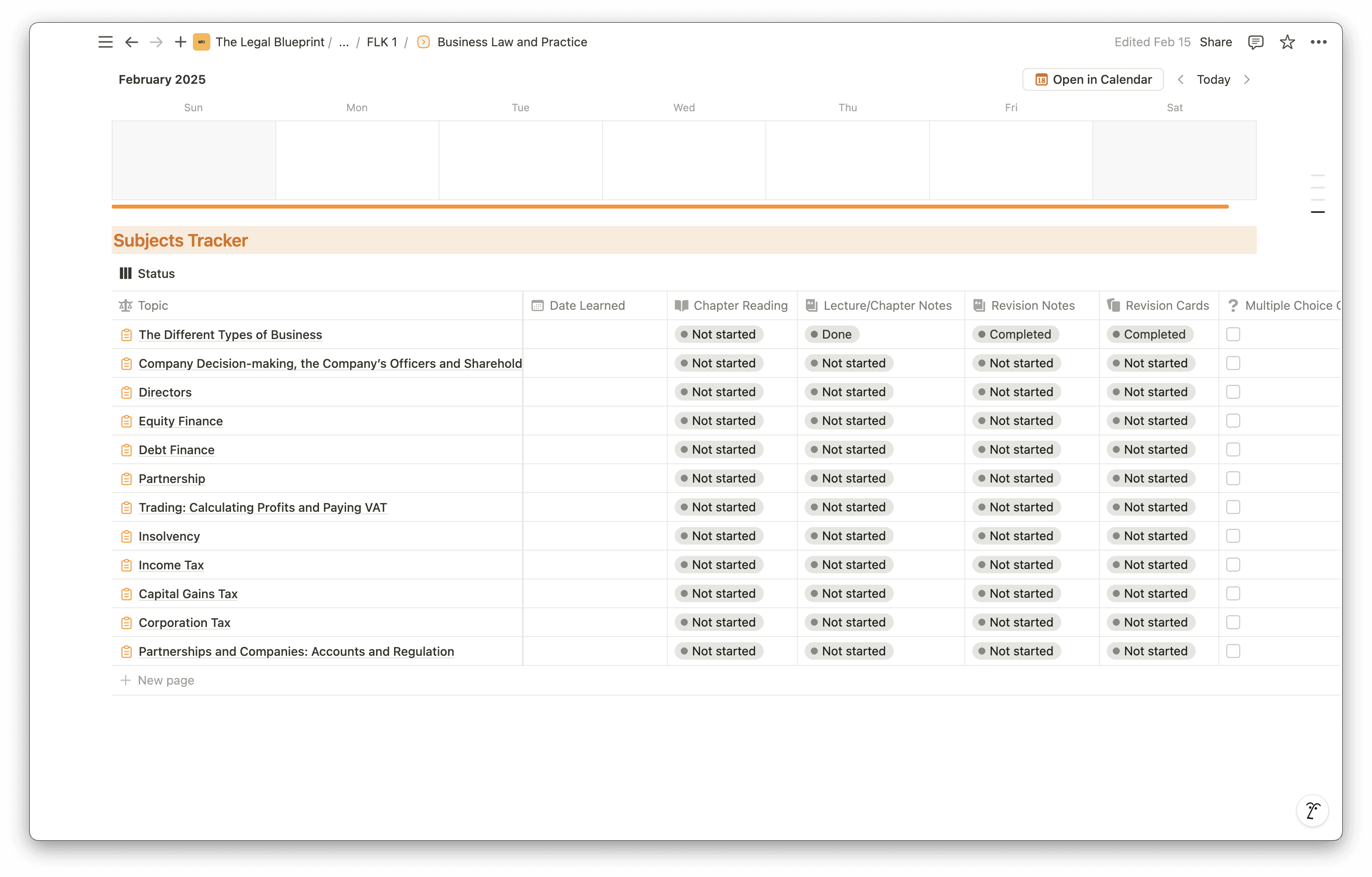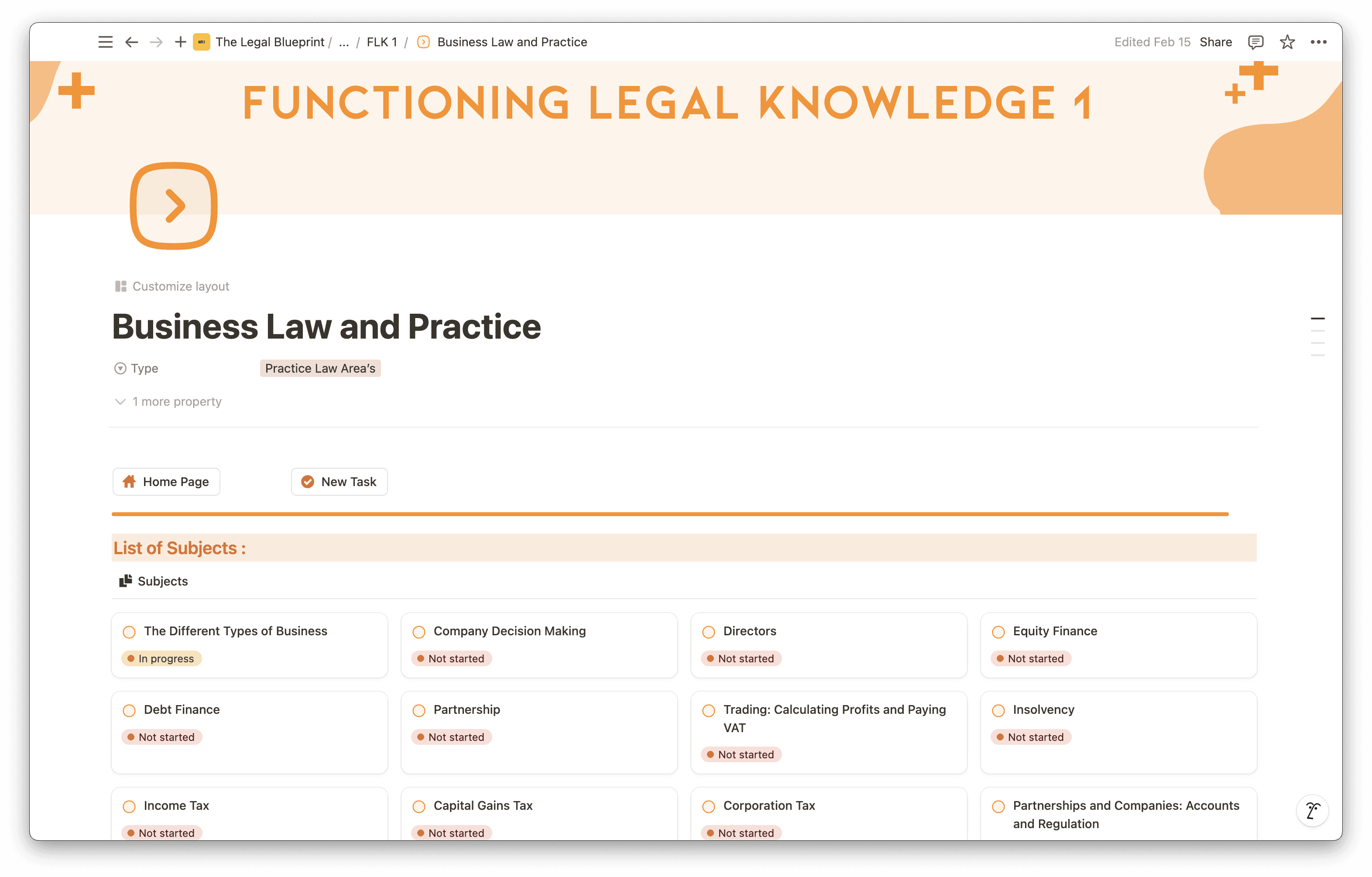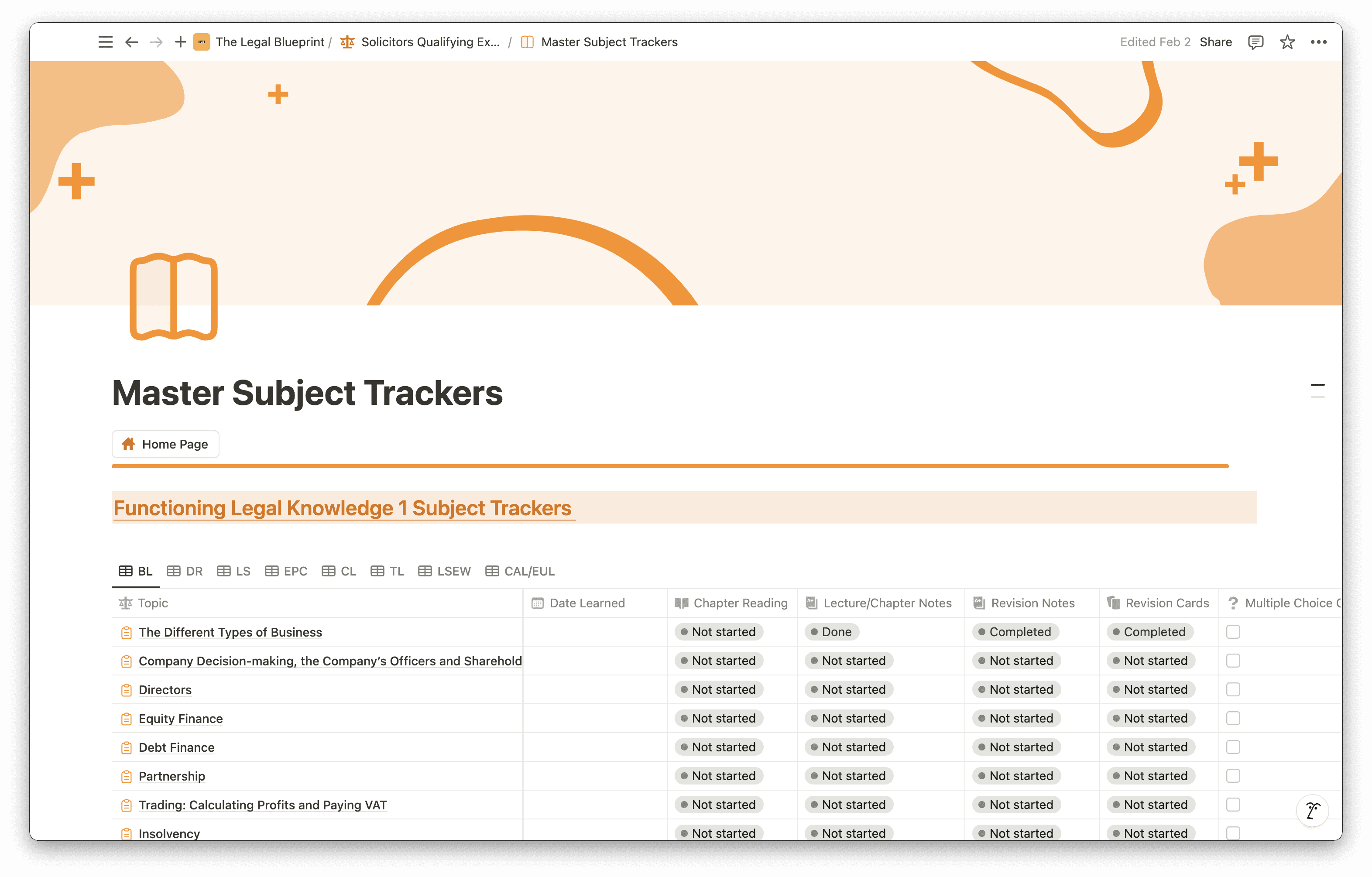 Every subject area across both FLK assessments is pre-loaded into the template — the six areas covered in FLK1 (Business Law and Practice, Dispute Resolution, Contract, Tort, Legal System of England and Wales, and Legal Services) and the seven in FLK2 (Property Practice, Wills and the Administration of Estates, Solicitors Accounts, Land Law, Trusts, Criminal Liability, and Criminal Law and Practice). Nothing needs to be built from scratch — you open it, duplicate it into your Notion workspace, and start using it from day one.