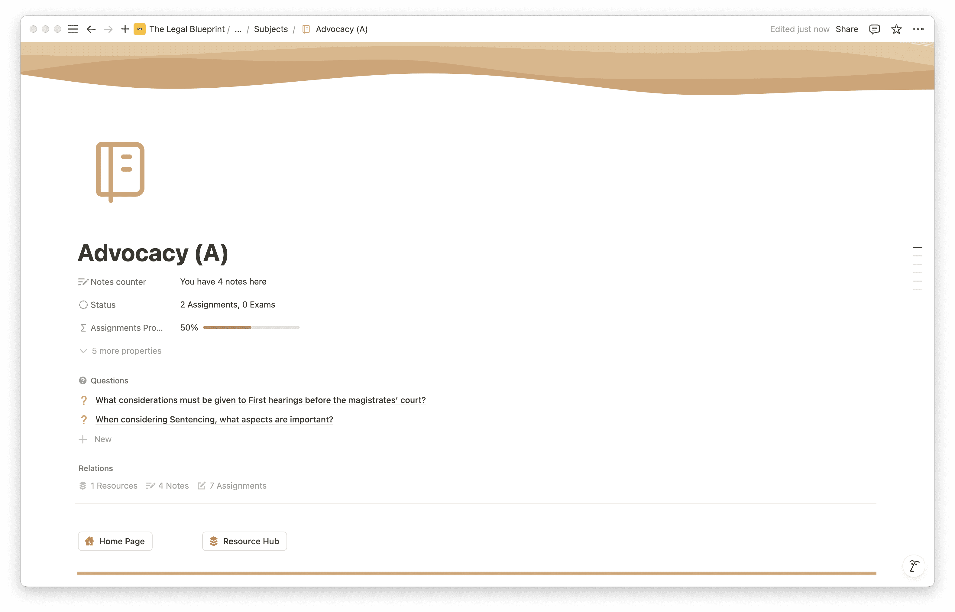 Each of the five practice areas has its own dedicated workspace within the template. Inside each one, you have space for notes, key legal principles, task lists, and resource organisation. Everything relevant to Criminal Litigation lives in one place. Everything relevant to Property Practice lives in another. When you sit down to prepare for a specific practice area, you are not hunting across documents — you open the room and start working.