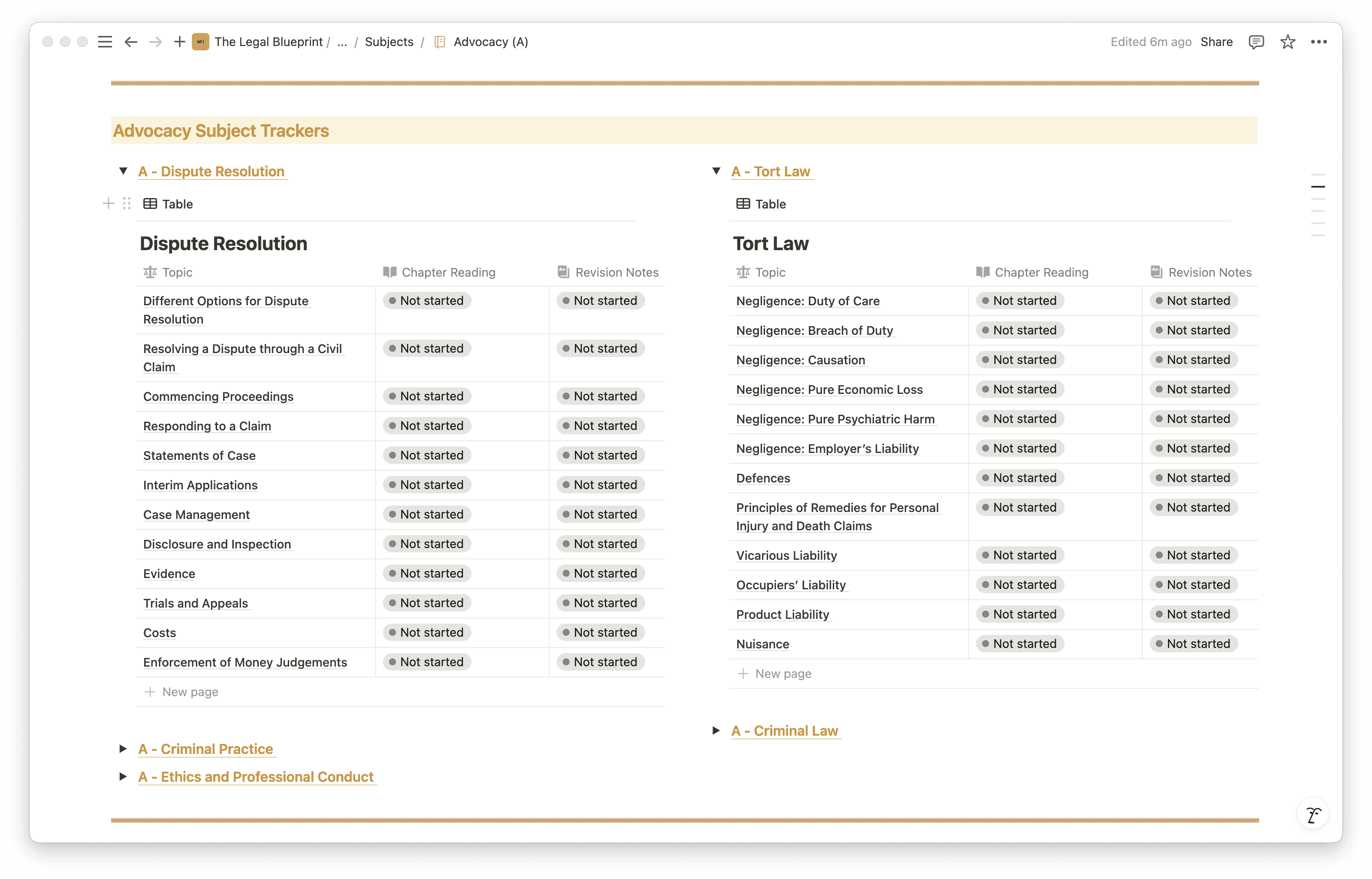 Each of the five practice areas has a dedicated entry in the Subjects database. You can track your progress across Criminal Litigation, Dispute Resolution, Property Practice, Wills and Intestacy/Probate, and Business Organisations — logging what you have covered, what needs revisiting, and how your preparation is distributed. Over time, this creates a clear picture of where your preparation is concentrated and surfaces the areas requiring more focused work.